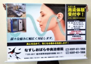 那須塩原市「なすしおばら中央治療院様」のタペストリーを製作をしました。 初回はポスターの製作でご依頼頂き納品致しましたが、パネル化しての掲示では風で飛ばされてしまうため「固定できるもの」ということで吊り下げも鋲止め固定も …